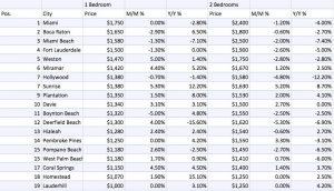 از طرفی Deerfield Beach (کاهش منفی 15.6 درصدی)، Miami Beach (کاهش منفی 7.1 درصدی) و Miami (کاهش منفی 2.8 درصدی) بیشترین کاهش در میانگین اجاره را داشتند. گران ترین میانه اجاره یک اتاق خواب مربوط به Miami، Boca و Miami Beach است.