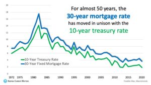 بازده اوراق قرضه خریداری شده خزانه، نرخی است که سرمایه گذاران هنگام خرید اوراق به دست می آورند. از قدیم، زمانی که نرخ خزانه بالا یا پایین می رود، نرخ وام 30 ساله به دنبال آن کم و زیاد می شود. در اینجا نموداری وجود دارد که رابطه میان این دو را در 48 سال گذشته نشان می دهد: