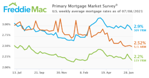 برطبق گزارش این هفته شرکت فردی مک (Freddie Mac) مورخ (July 08, 2021)، در پی کاهش بازده خزانه داری آمریکا نرخ بهره وام مسکن در این هفته کاهش یافت. در حالی که نرخ بهره وام مسکن تمایل زیادی به پیروی از بازده خزانه داری آمریکا دارد، سایر عوامل می توانند تأثیرگذار باشند، مانند بازارهای کار که همچنان در گزارش وضعیت مشاغل طی هفته گذشته، تداوم بهبود را نشان دادند. انتظار داریم که رشد اقتصادی به تدریج نرخ بهره وام مسکن را بالاتر ببرد، اما خریداران مسکن و ریفاینانس کنندگان وام هنوز فرصتی برای استفاده از نرخ های وام مسکن 30 ساله را دارند که انتظار می رود در حدود 3 درصد باقی بماند.