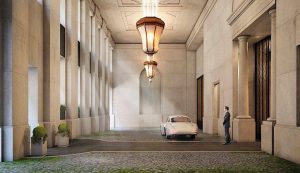 فضای داخلی با Studio Sofield طراحی شده است، در ورودی واحدها، سالن های رسمی با طبقه های سنگی سفید و کانترهای گرانیتی از جنس Macauba هستند، ارتفاع کف تا سقف 14 فوت است و سقف و دیوار حمام و دستشویی های بزرگ با مرمر سفید طرحدار تکمیل شده است. این یک منظره از اتاق پذیرایی است: